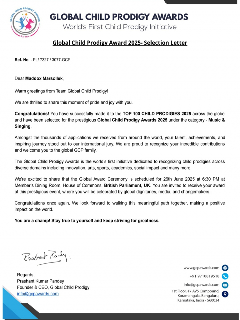 Maddox Marsollek wurde in der Kategorie Musik und Gesang ausgewählt und gehört nun zu einer außergewöhnlichen Gruppe von Kindern, die in verschiedenen Bereichen herausragende Leistungen erbracht haben, darunter Wissenschaft, Innovation, Kunst, Musik, Sport, Unternehmertum und sozialer Einfluss. Mit dieser Anerkennung gehört Maddox Marsollek zu einer globalen Gemeinschaft junger Talente, deren Arbeit die Zukunft prägt.